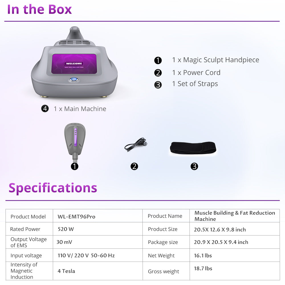 MagicCurve EMS & Electromagnetic Stimulation Machine, WL-EMT96PRO, features a single EMS electromagnetic handle with both EMS and EL functionalities. Experience the benefits of EMS technology and electrical muscle stimulation with our cutting-edge WL-EMT96PRO. Elevate your fitness journey with this compact and effective EMS machine.